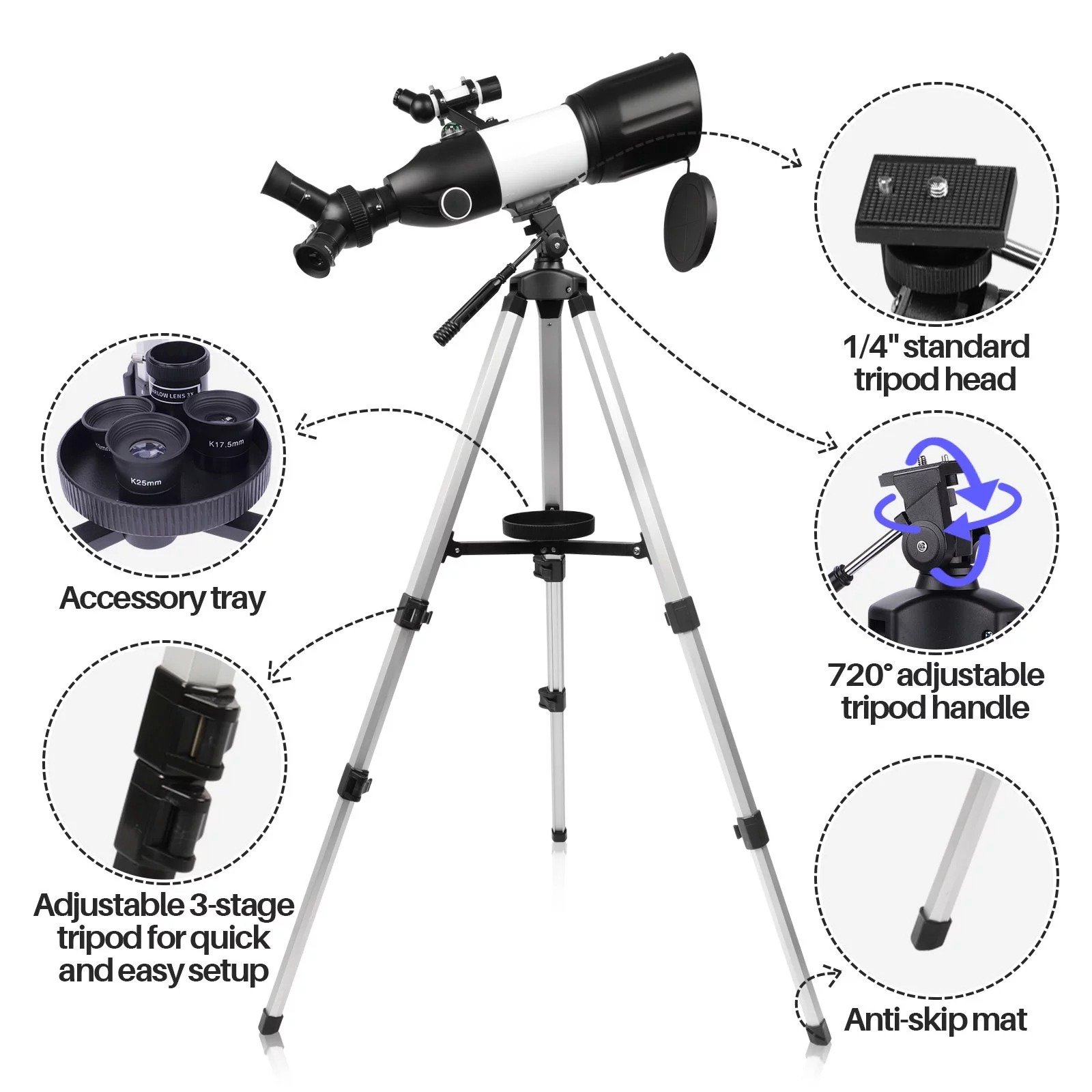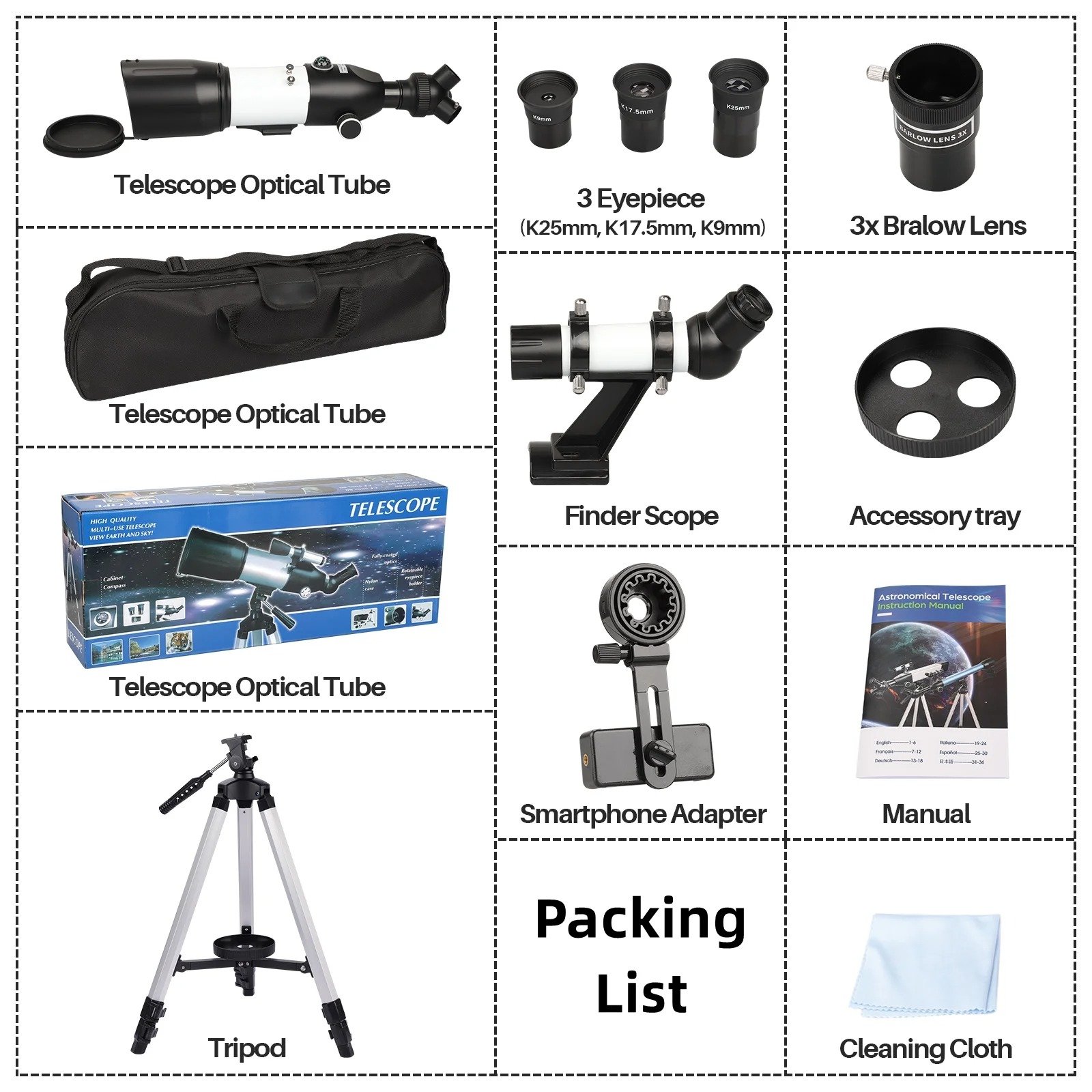 Explore the universe with our 80mm Telescope, perfect for beginners. Features 3 rotatable eyepieces for stunning celestial views.