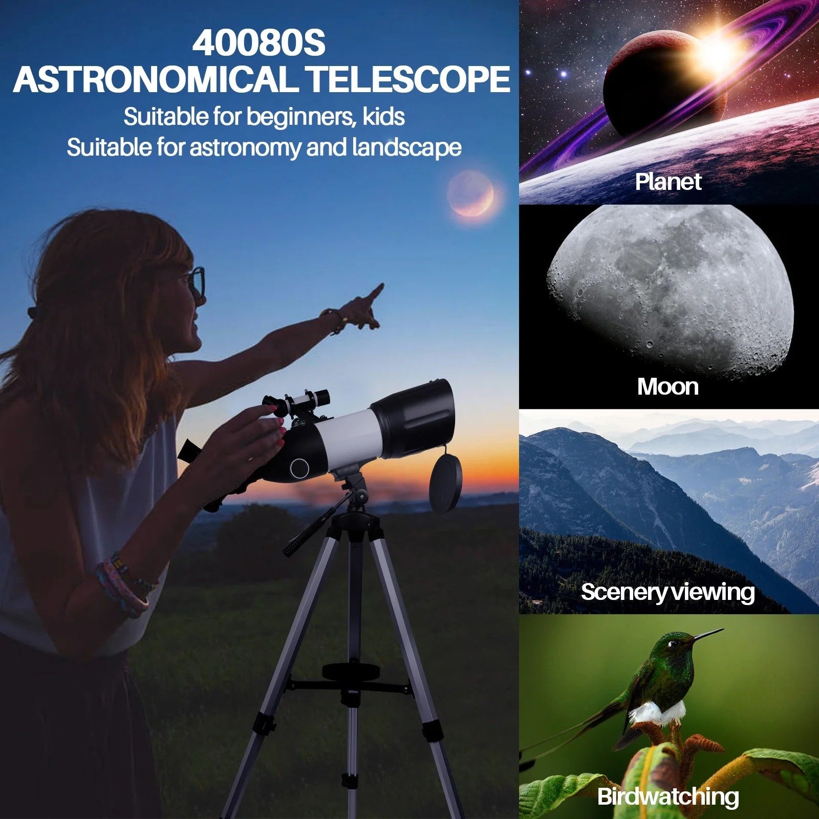 The 80mm Large Aperture Refractor Telescope is designed for all astronomy enthusiasts. Whether you’re a beginner or an experienced stargazer, this telescope offers incredible views of the moon, planets, and beyond.