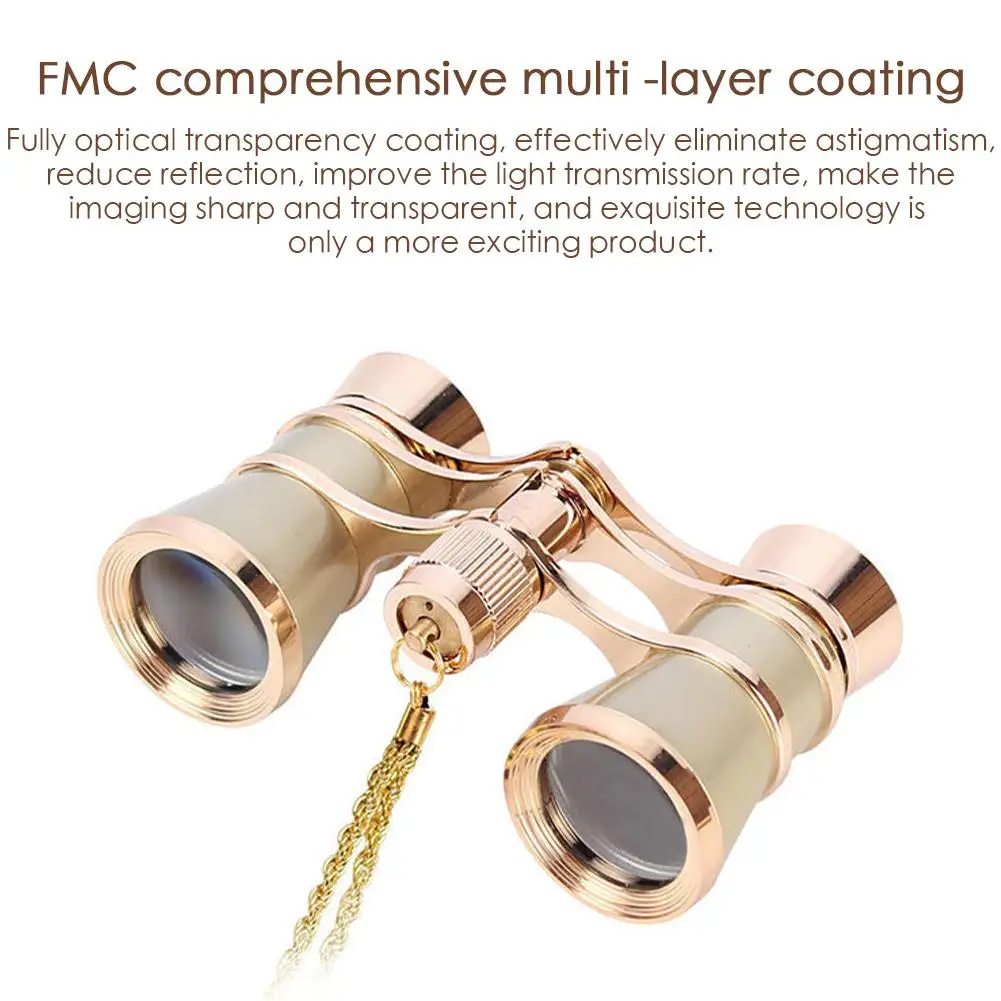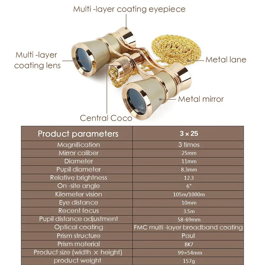 Select the lens, 3X2.5 magnification, especially suitable for cinema. These opera glasses are specially equipped with a chain and can be hung around the neck for easy portability and viewing.